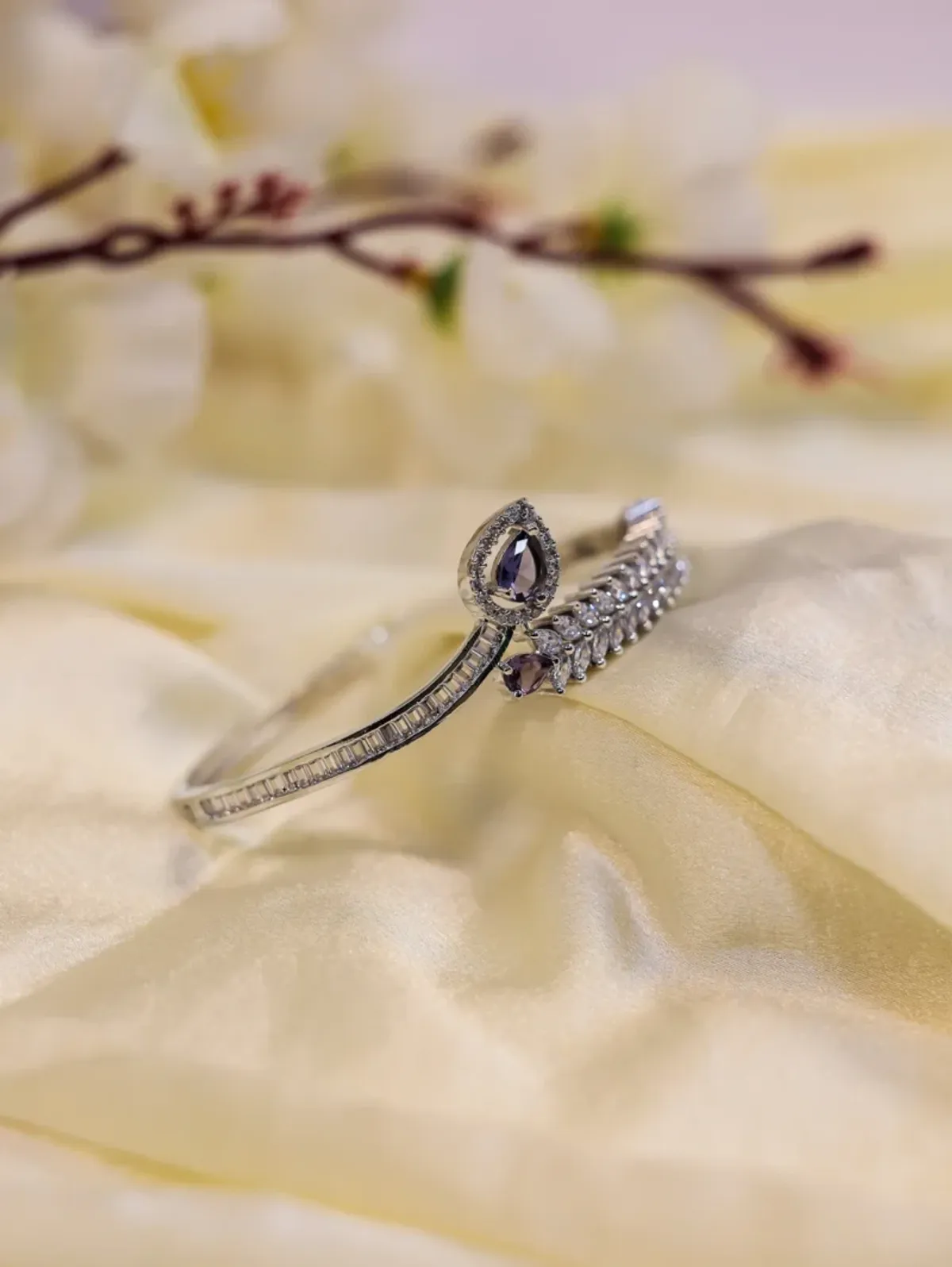 Design Elegant silver-tone bangle with textured detailing and purple crystal charm