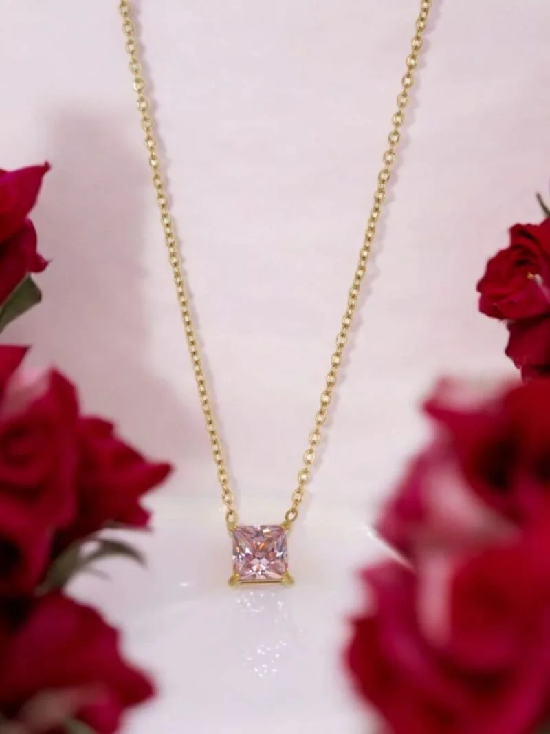 Delicately designed with a princess-cut blush pink stone, the Blush Radiance Pendant captures soft elegance and timeless charm. Set in a sleek gold frame and paired with a fine chain, this pendant is the perfect choice for date nights, celebrations, or a hint of romance in your everyday style.