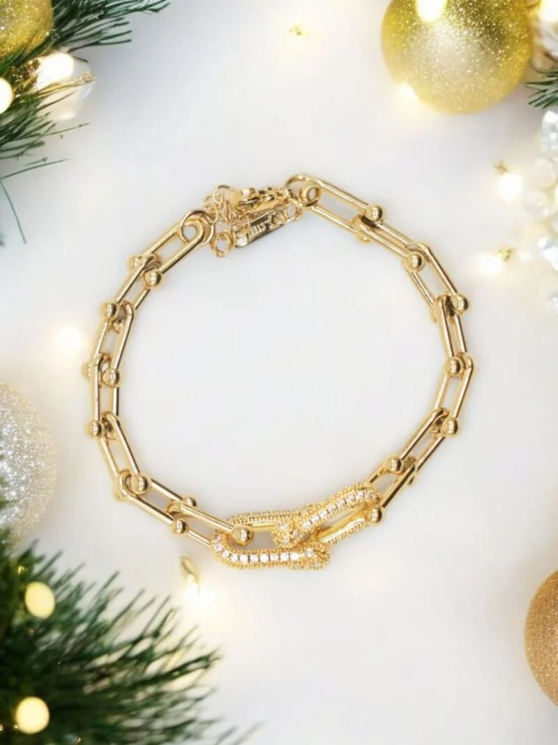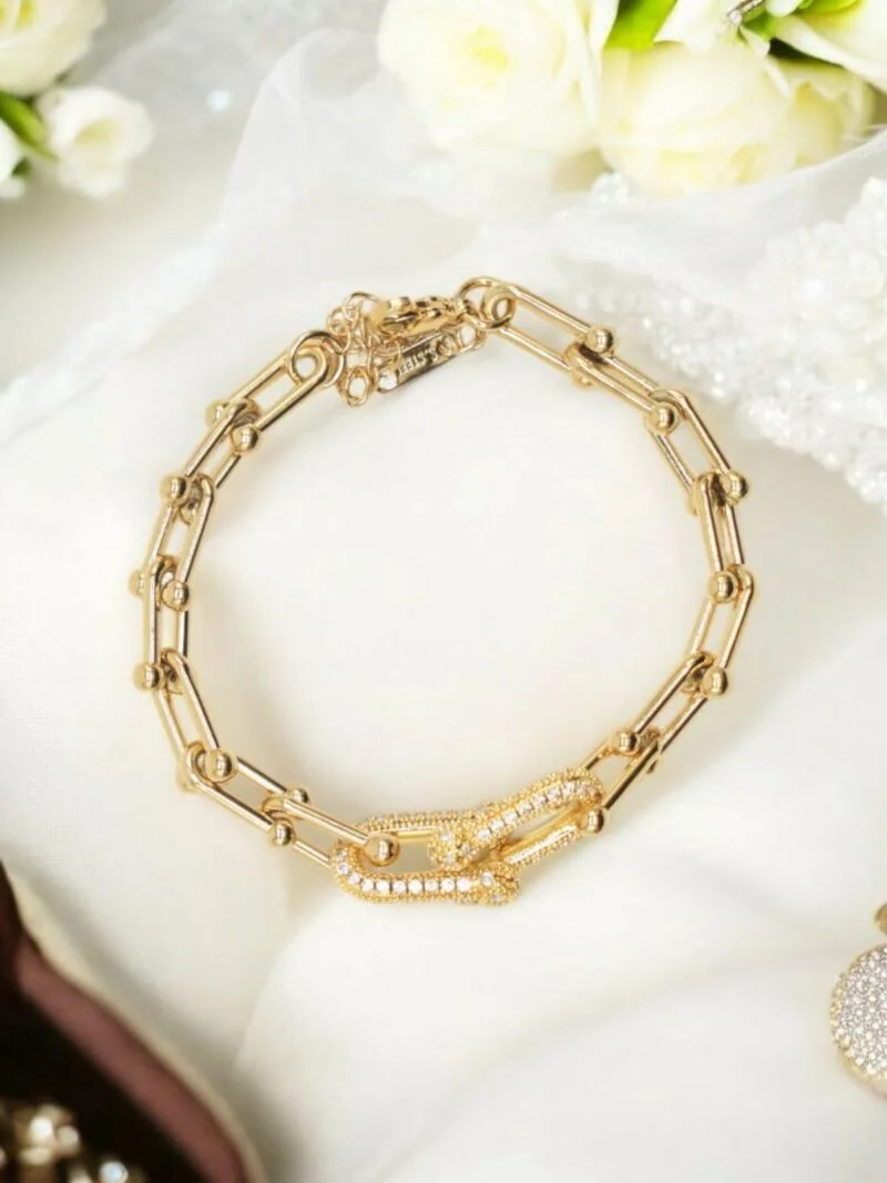 Elevate your wrist game with this striking double-chain bracelet, designed with bold gold links and a dazzling pavé clasp. It’s the perfect mix of minimalism and statement—crafted for the modern muse.