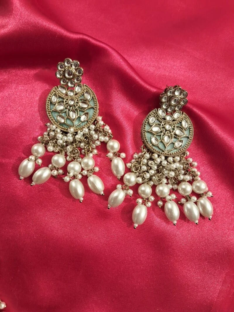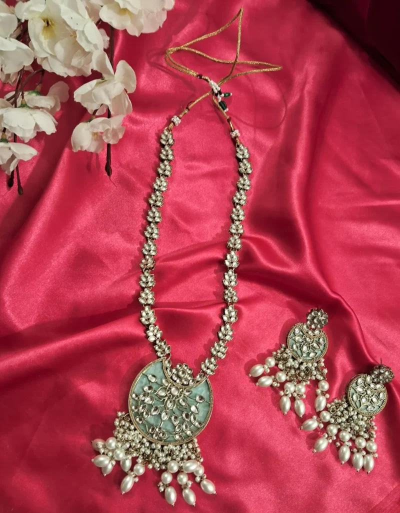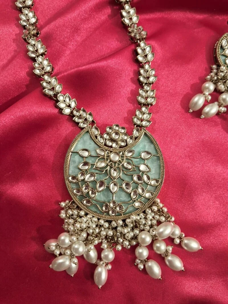 An exquisite blend of mother-of-pearl and mint green kundan work, bringing a soft radiance to your jewelry collection. Perfect for grand functions and bridal wear, it stands out beautifully when worn with a pastel anarkali or an ivory chikankari saree.