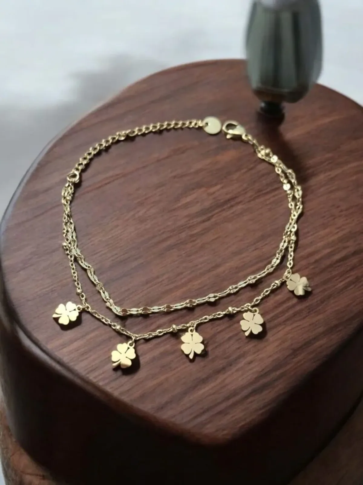 | Design | Double-layer gold-tone chain bracelet with dangling clover charms |