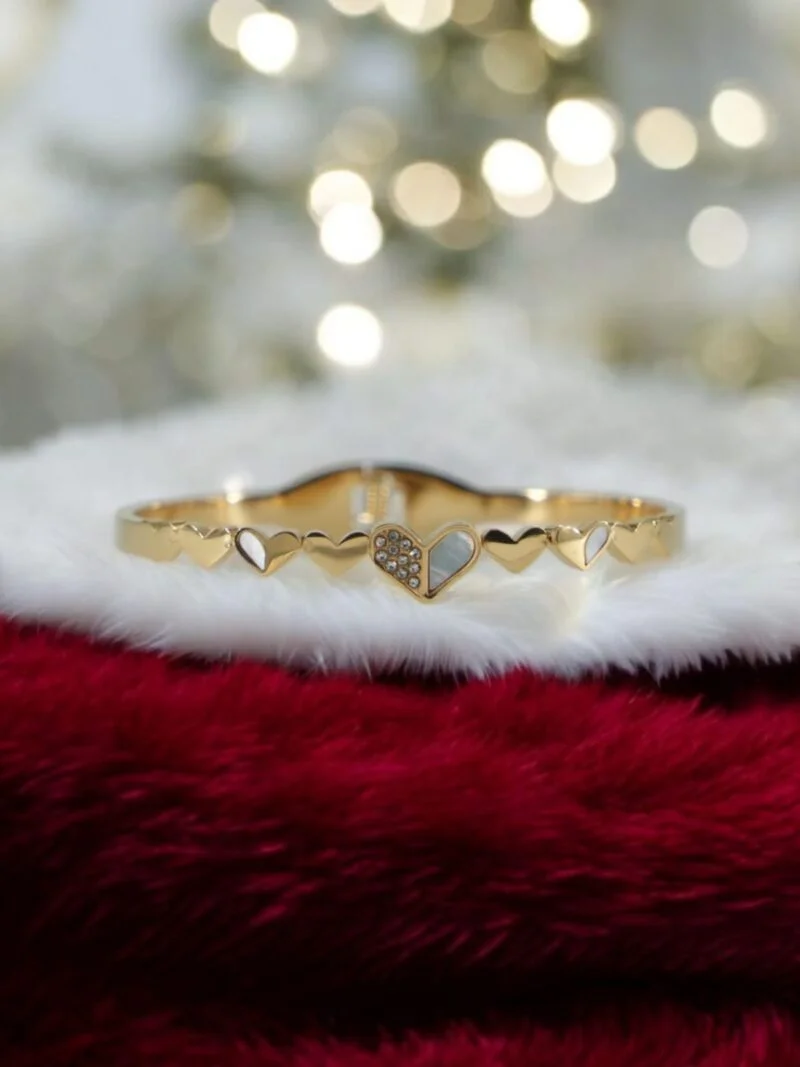 Fall in love with the charm of our Hearts In Harmony Bracelet, designed in an anti-tarnish gold finish. Featuring a series of dainty heart motifs — from polished to mother-of-pearl and sparkle-studded — this bracelet beautifully blends modern romance with minimal elegance. A must-have for gifting or styling your daily looks. ✅ Anti-Tarnish Golden Finish