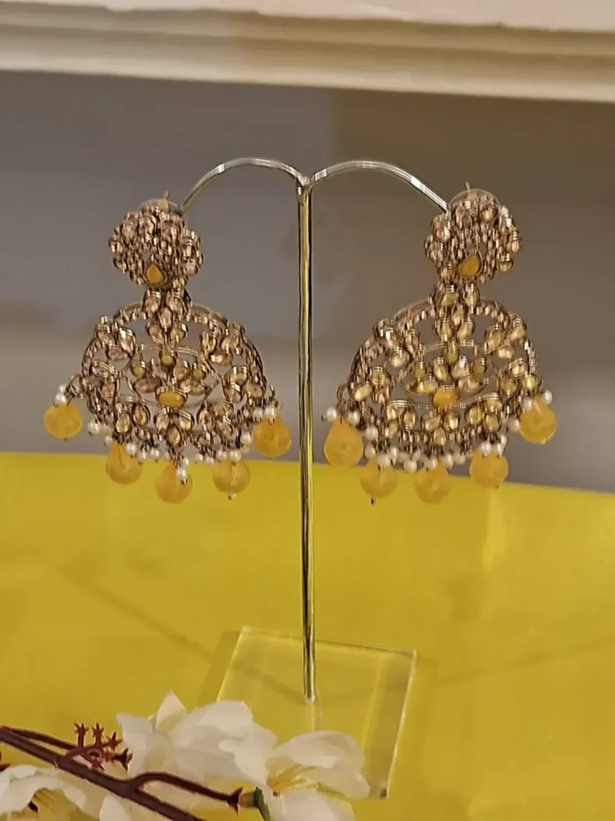 Design Traditional reverse AD dangler earrings with intricate detailing and yellow bead drops