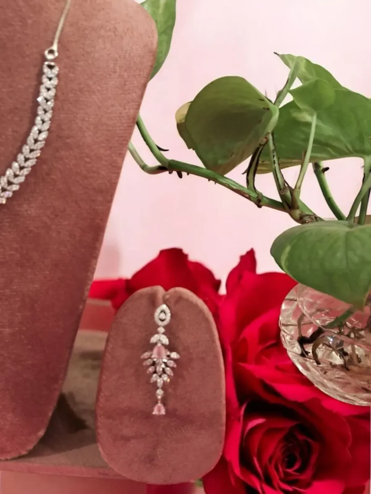 Add timeless elegance to your jewelry collection with the stunning Silver Rooh-E-Gul Necklace Set, inspired by delicate floral vines and modern luxury aesthetics. Featuring sparkling crystal stones arranged in a graceful V-shape design with matching earrings, this set enhances your neckline beautifully.