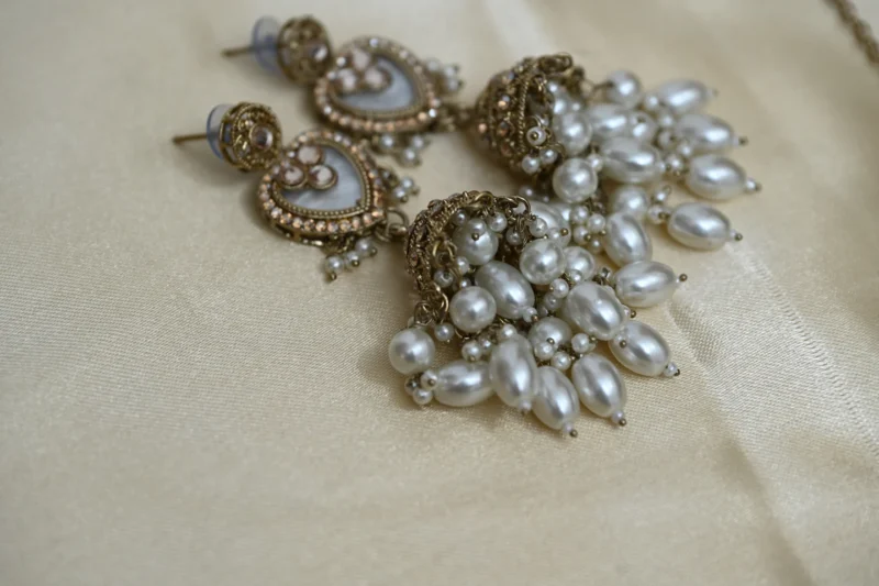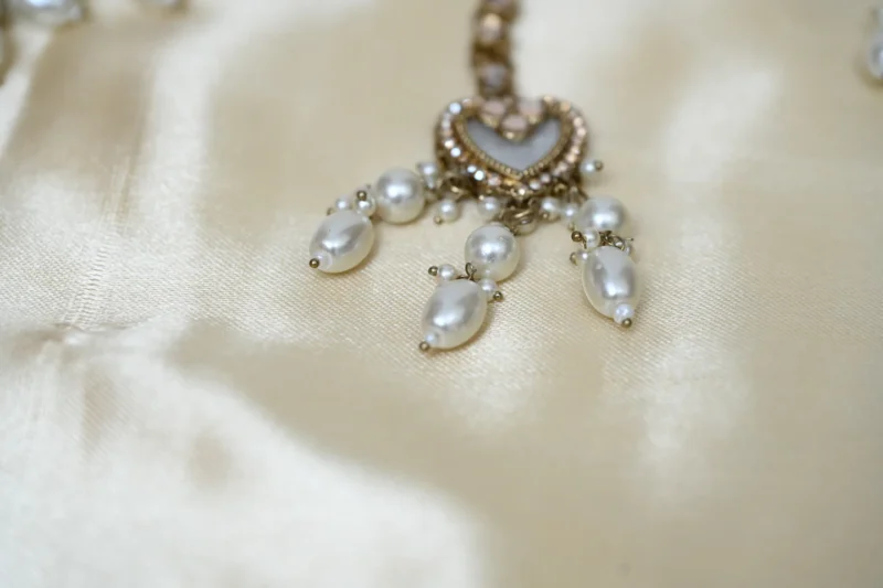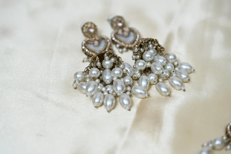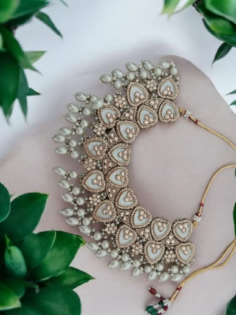 A beautiful blend of white pearls and intricate Kundan work, this set is perfect for semi-bridal or traditional occasions. Best paired with pastel or gold-toned sarees and lehengas.
