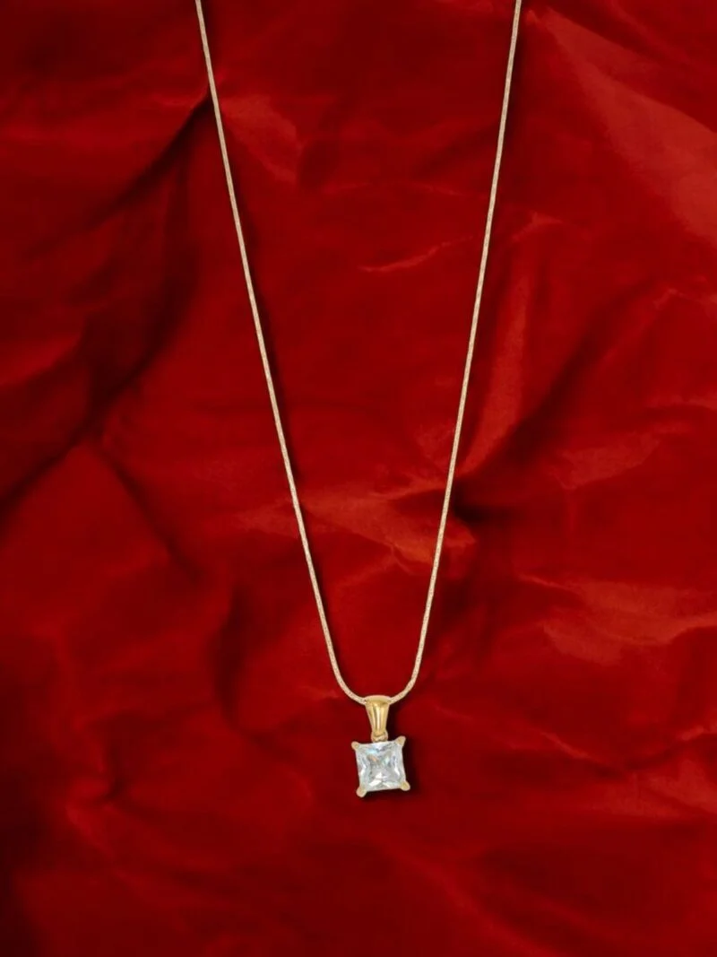 Timeless elegance, redefined. This Solitaire Square Pendant features a brilliant princess-cut stone suspended on a delicate gold-toned chain. Perfect for everyday minimalism or a touch of shine on a night out — it’s the kind of classic that never fades.