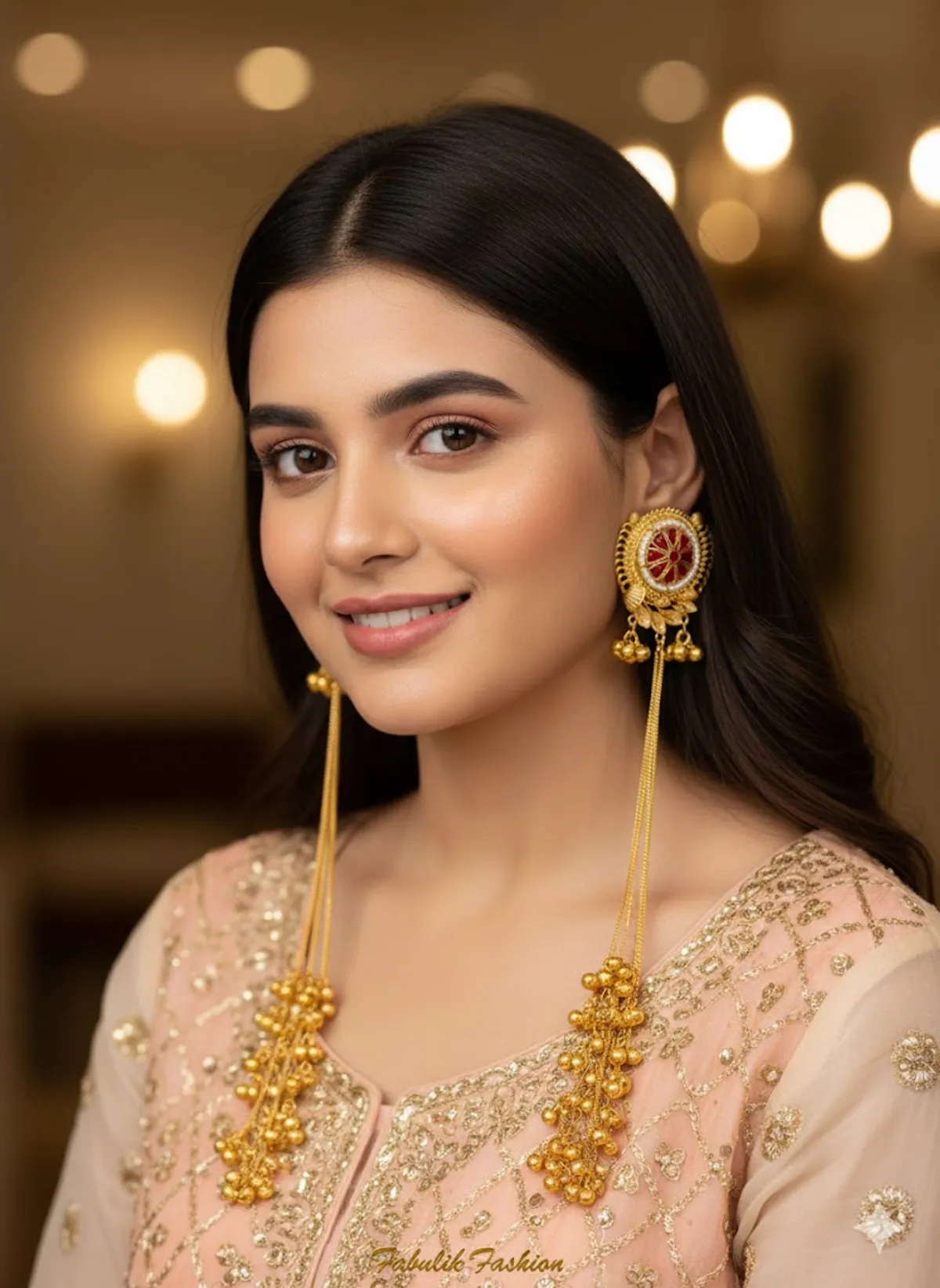 | Design | Traditional Kashmiri long earrings with circular stud, chain extensions, and jhumka bead clusters |