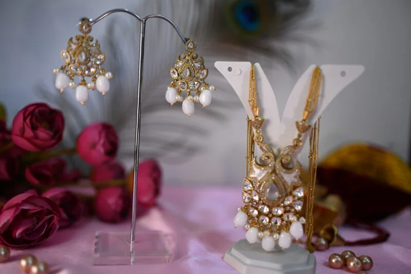 A dazzling fusion of golden kundan and zirconia, ideal for traditional gatherings and wedding receptions. It pairs beautifully with a heavily embroidered saree or a classic Banarasi lehenga.