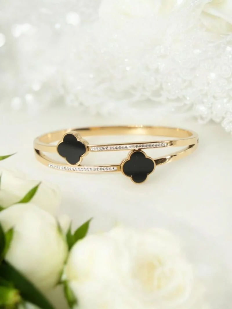 Velvet Clover Duo Bracelet – Black Charm with Sleek Gold Bands