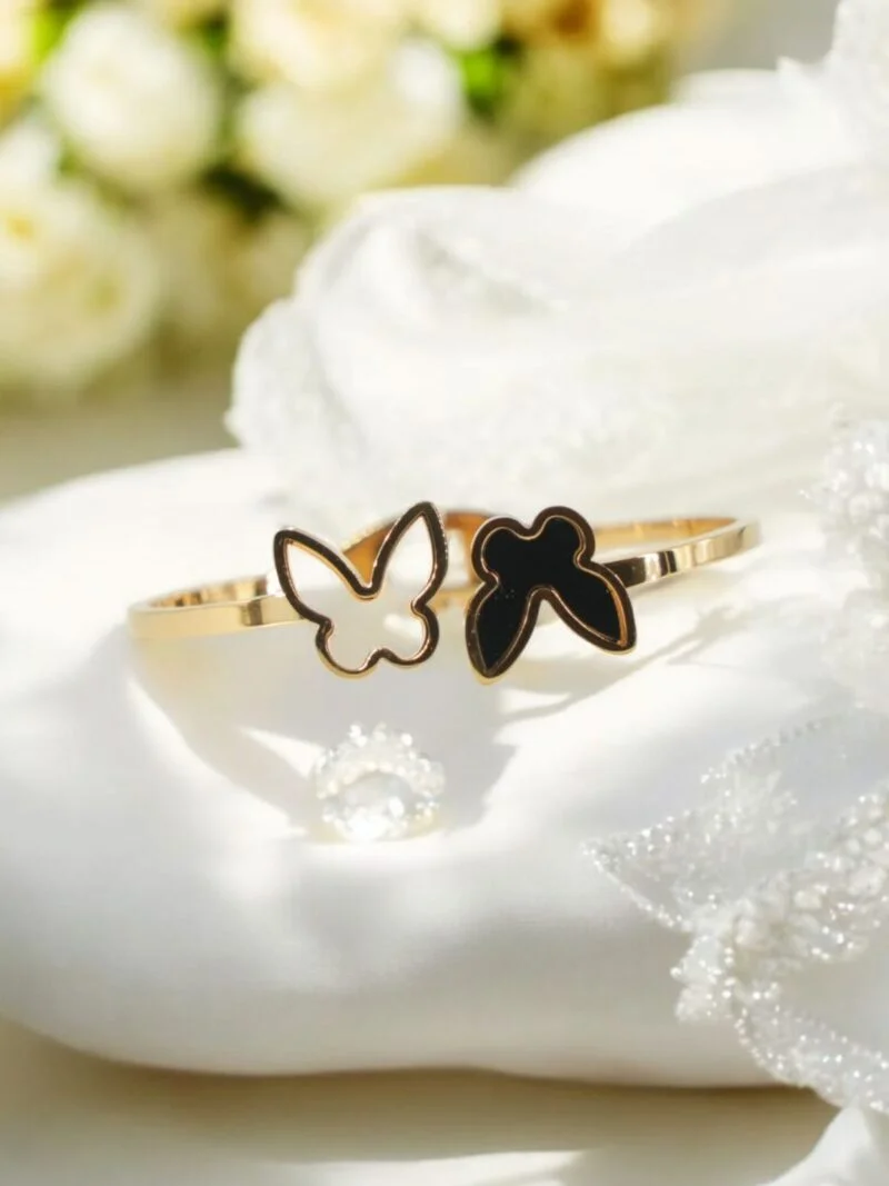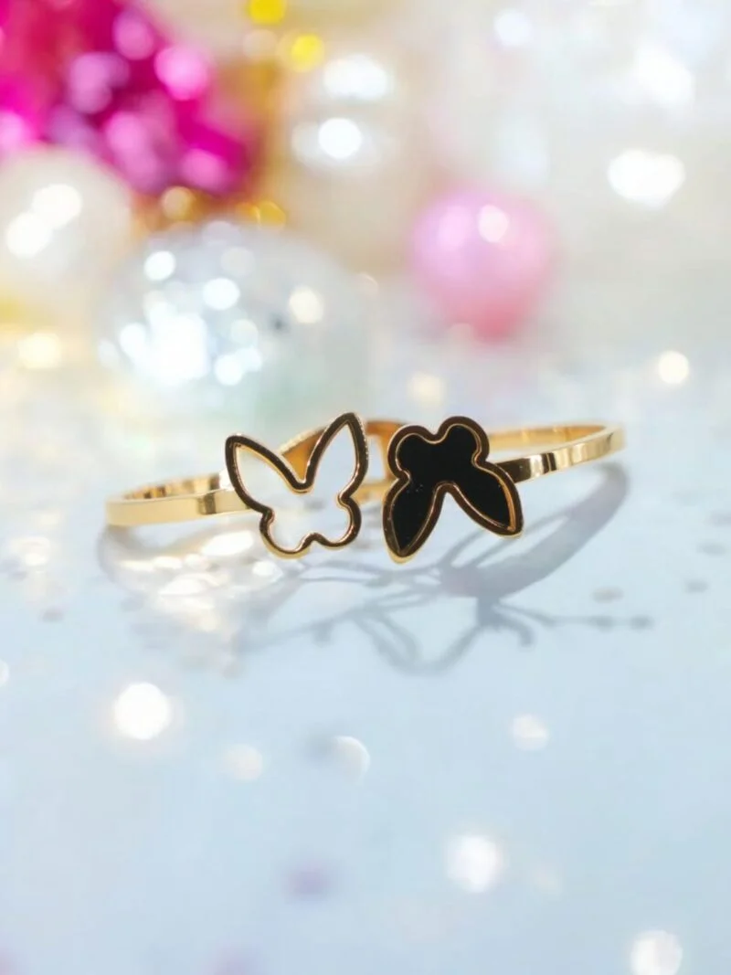 Add a playful twist to your look with our Whimsy Duo Bracelet, designed with an open butterfly outline and a solid black bow charm on a sleek anti-tarnish gold band. Whether you’re dressing up or keeping it casual, this piece brings just the right dose of fun and flair to your style.