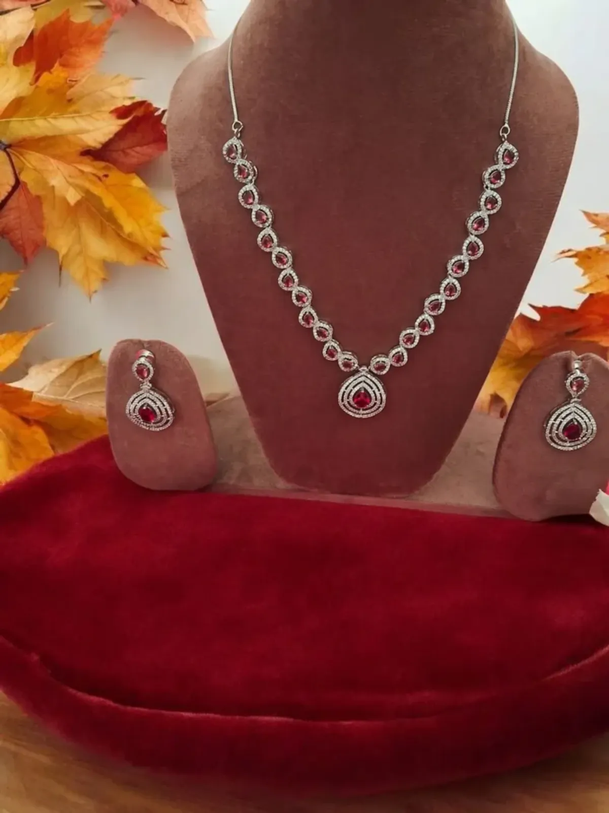 Enhance your elegance with this beautiful White Manikya Ruby Zirconia Necklace, crafted to give you a royal and graceful look. The necklace features a stunning arrangement of ruby zirconia stones set in a premium gold finish, highlighted with a luxurious ruby pendant at the center.