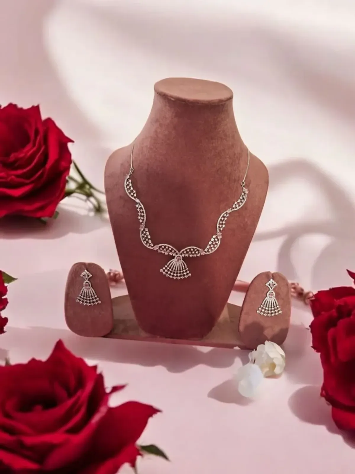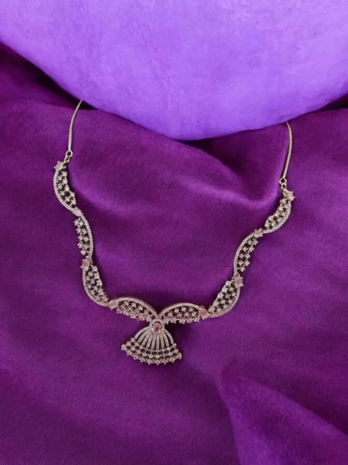 The delicate curved chain design enhances the neckline beautifully, making it perfect for weddings, festive occasions, parties, and traditional functions. The premium silver finish combined with pink zirconia accents adds a sophisticated and feminine touch.