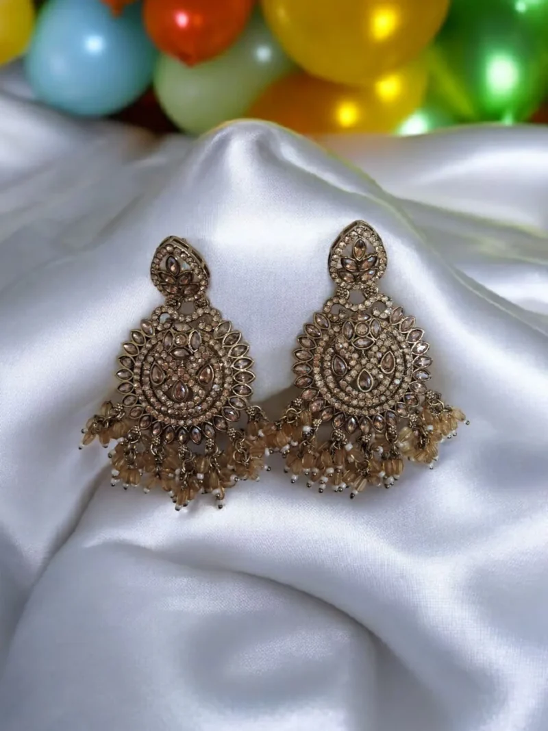 Inspired by Mughal grandeur, the Zareen Mughal Danglers blend antique gold charm with intricate stone detailing and delicate beads. These statement earrings are crafted for those who love a touch of royal heritage in their jewelry, making them perfect for celebrations and traditional attire.